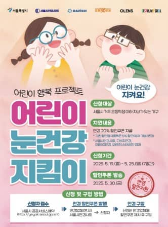 혹시 여러분의 자녀가 초등학생 이하이고, 안경이 필요하신가요?그렇다면 지금 주목해 주세요.서울시가 진행하는 ‘어린이 눈건강 지킴이’ 사업을 통해 전국 1,400여 개 매장에서 안경을 20% 할인된 가격으로 구매할 수 있는 기회를 드리고 있습니다.2025년 5월 19일(월)부터 단 7일간!2차 접수가 시작됩니다.이번 기회를 놓치지 마세요!어린이 눈건강 지킴이란? 서울시가 디지털 기기 사용 증가로 눈 건강이 위협받는 어린이들을 위해 마련한 건강복지 프로젝트입니다.2024년 2월에 1차 신청을 받았고, 큰 호응에 힘입어 2025년 5월에 2차 접수를 진행하게 되었습니다.신청 대상은 누구인가요?서울시 거주자 중, 2012년 1월 1일 이후 출생한 자녀를 둔 가정이면 누구나 신청할 수 있습니다.나이 기준: 초등학..